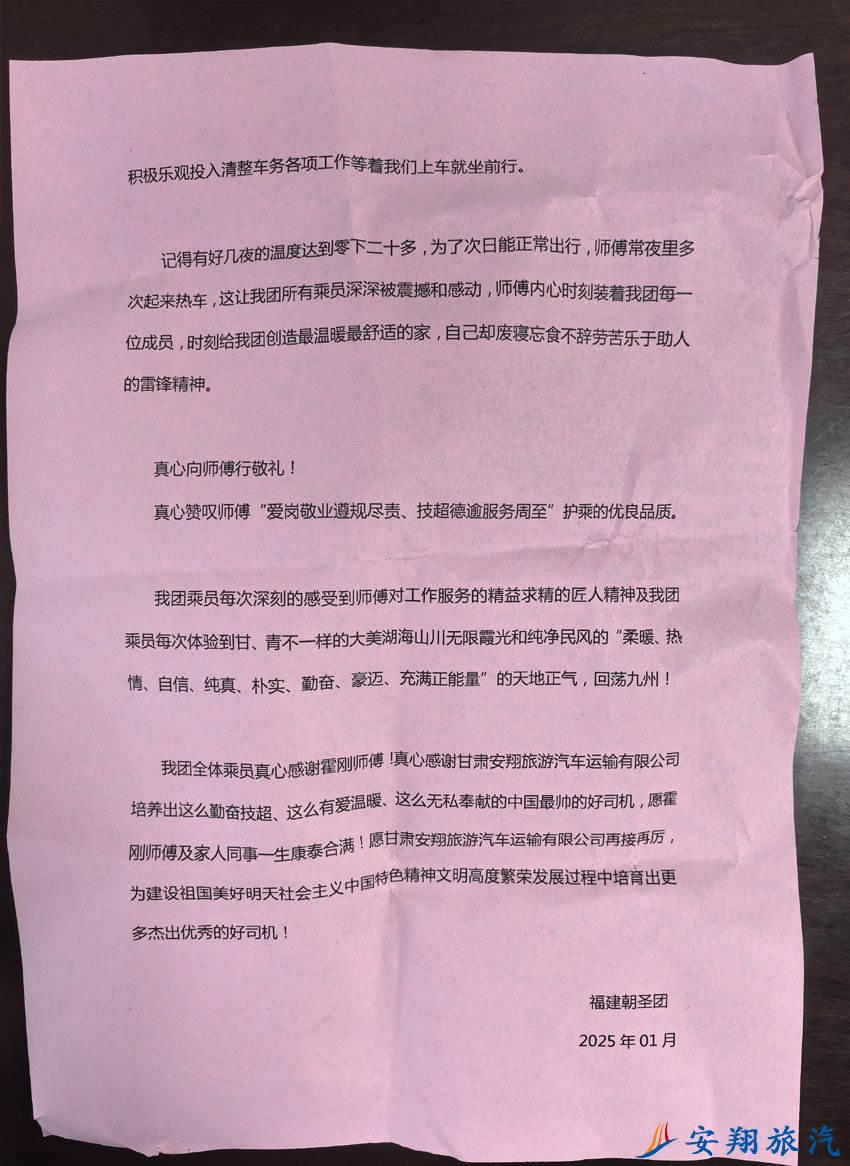 我團全體乘員真心感謝霍剛師傅!真心感謝甘肅安翔旅游汽車運輸有限公司培養(yǎng)出這么勤奮技超、這么有愛溫暖、這么無私奉獻的中國最帥的好司機,愿霍剛師傅及家人同事一生康泰合滿!愿甘肅安翔旅游汽車運輸有限公司再接再厲為建設祖國美好明天社會主義中國特色精神文明高度繁榮發(fā)展過程中培育出更多杰出優(yōu)秀的好司機!